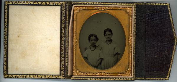 Wonderful smiling girls in a scarce case. Clean and pretty sixth plate ambrotype that you will
