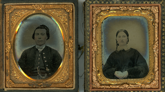 Pair of early war ninth plate ambrotypes of a Union soldier and his wife. Each is presented in its own worn