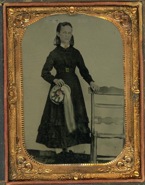 | T-002 The Opium Addict Intriguing image of a very skinny young lady. When I got it, there was a small newspaper clipping of an ad for an opium cure in the back. Someone had gone to the trouble of "laminating" it with scotch tape (thanks!). Bright and nice quarter plate tintype in full, worn paper and leather case. Some tinting to image. There is an odd scuff or something in the sky above her head, but doesn't really affect the appeal. $95.00 |