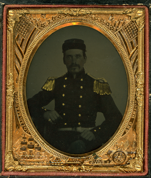 | T-004 U.S. Marine Corps Rare image of a Civil War marine. Standard marine corps uniform. The red trim translates as black in these images. Somewhat dark as seen in scan, but a good representative piece. Sixth plate tintype with patriotic mat presented in a whole, worn paper and leather case with split hinges. $425.00 |